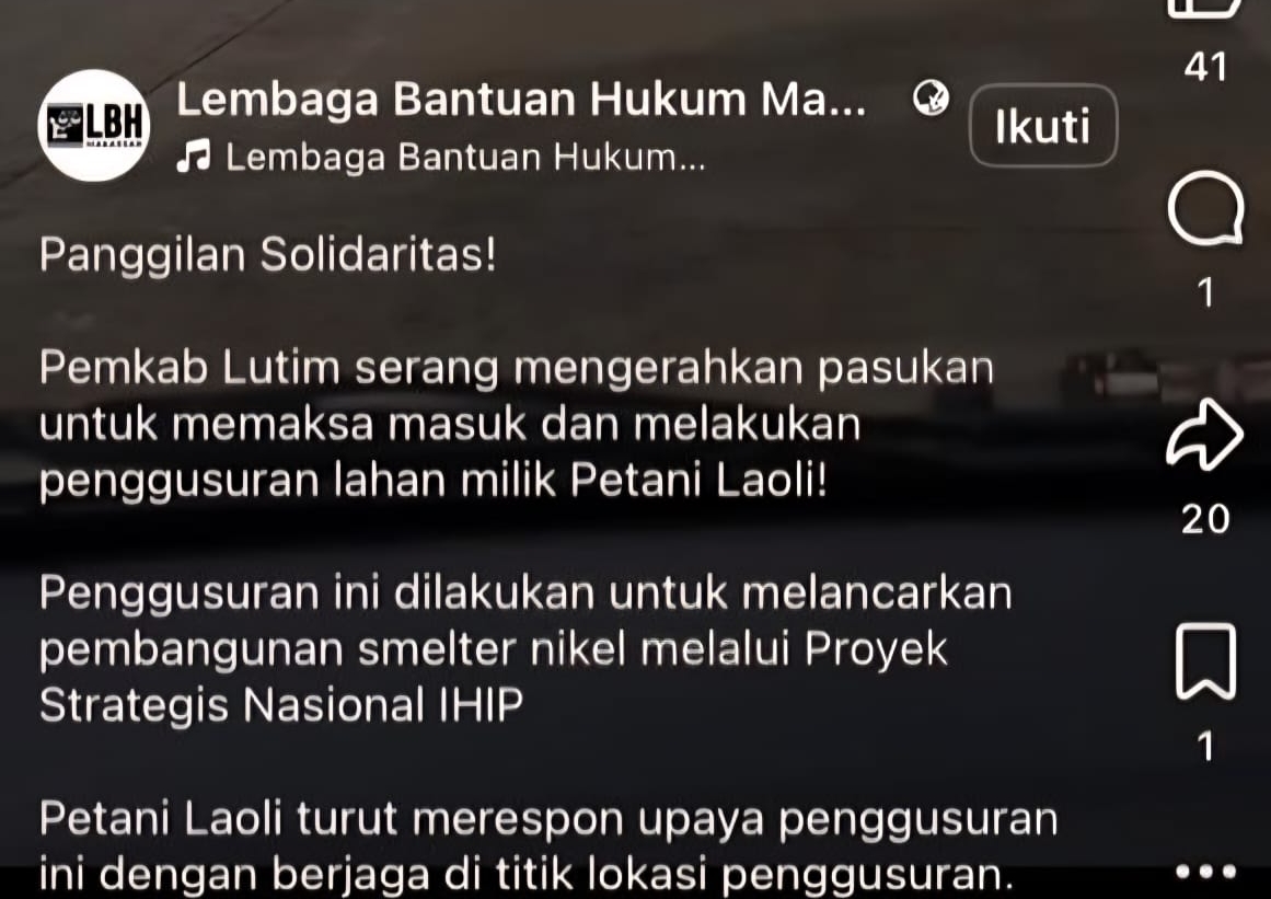 “Pemkab Lutim sedang mengerahkan pasukan untuk memaksa masuk dan melakukan penggusuran lahan milik Petani Laoli,” tulis akun FB Lembaga Bantuan Hukum Makassar – YLBHI, Senin (16/02/2026).