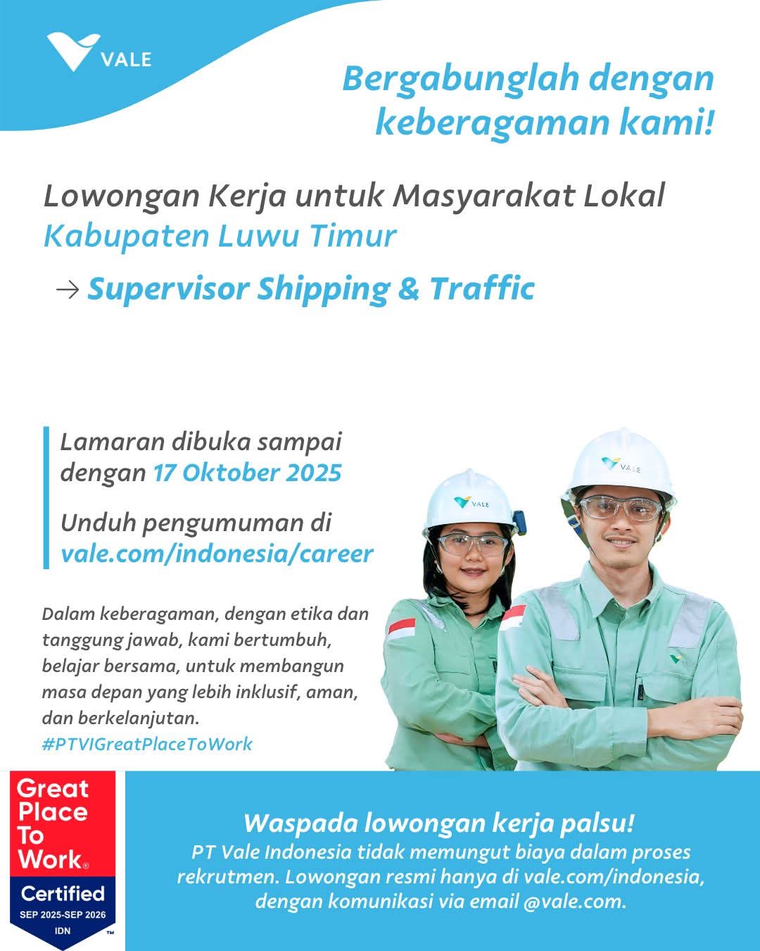 Melalui proses rekrutmen ini, PT Vale tidak hanya mencari tenaga profesional yang kompeten, tetapi juga ingin memperkuat nilai keberagaman dan inklusivitas di lingkungan kerja. Langkah ini sejalan dengan visi perusahaan untuk menjadi tempat kerja yang hebat (Great Place to Work) dan berkontribusi positif terhadap pembangunan berkelanjutan di Indonesia.