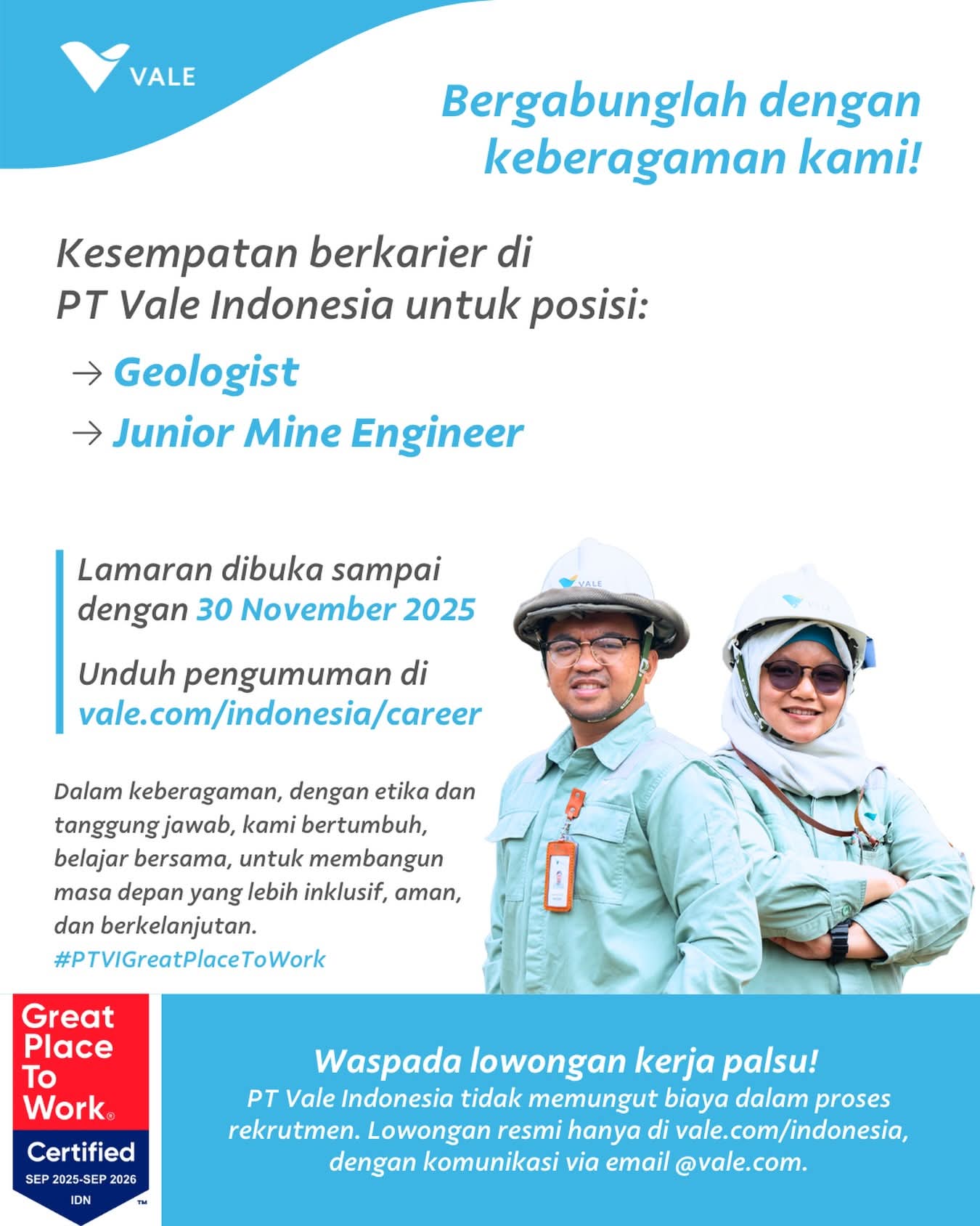 LUWU TIMUR – PT Vale Indonesia kembali membuka peluang karier bagi putra-putri terbaik bangsa. Melalui pengumuman resmi, perusahaan pertambangan tersebut menawarkan kesempatan bagi kandidat yang ingin berkarier sebagai Geologist dan Junior Mine Engineer. Rekrutmen ini dibuka hingga 30 November 2025.