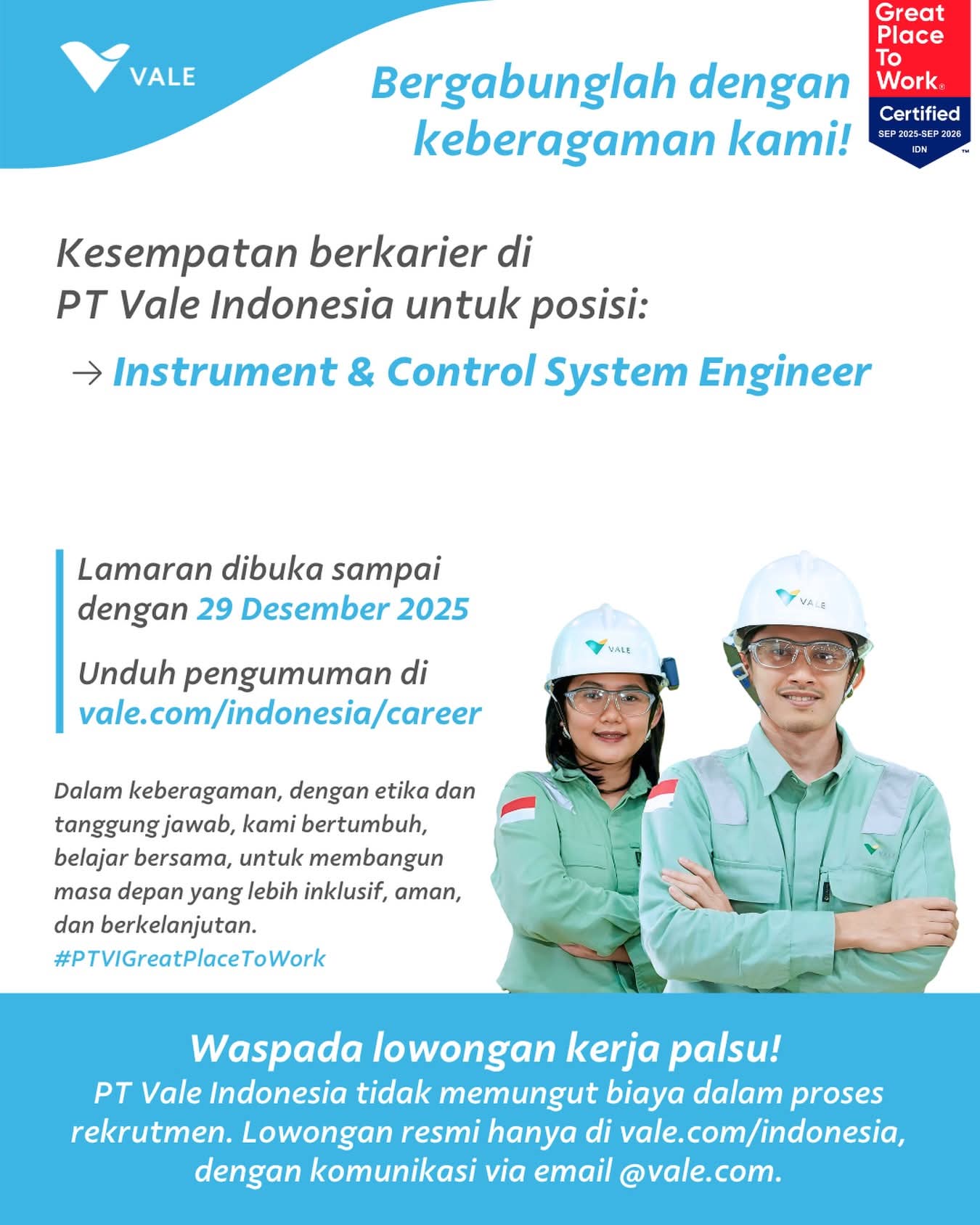 PT Vale Indonesia juga telah tersertifikasi sebagai Great Place to Work periode 2025–2026. Pendaftaran untuk posisi tersebut dibuka hingga 29 Desember 2025.