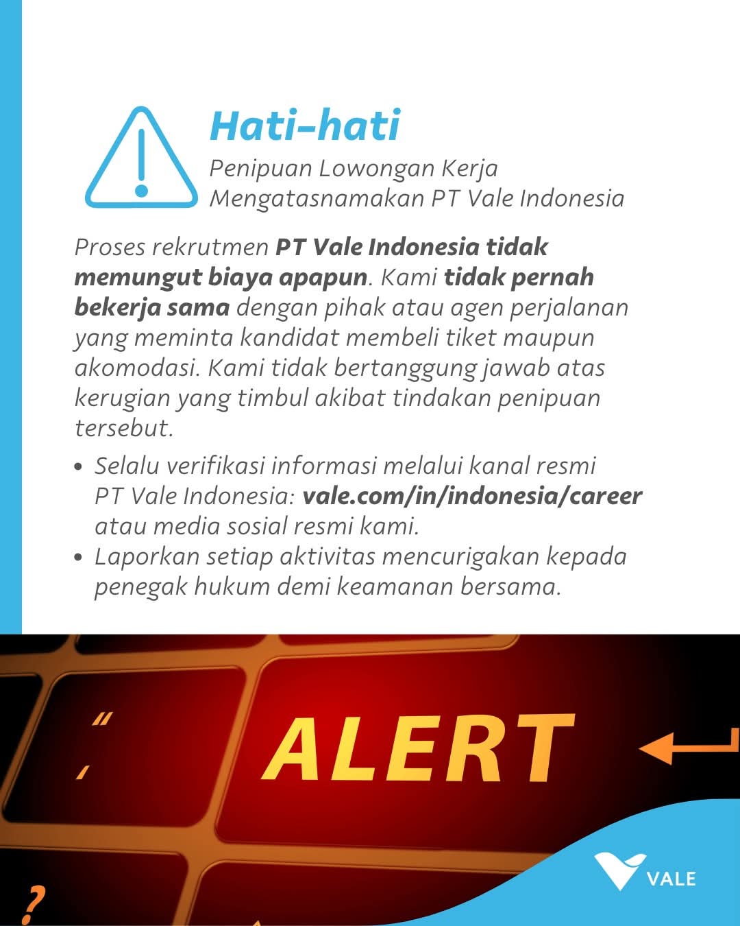 PT Vale Indonesia menegaskan tidak bertanggung jawab atas kerugian yang timbul akibat tindakan penipuan oleh pihak-pihak yang tidak bertanggung jawab. Karena itu, masyarakat diminta untuk tidak mudah tergiur tawaran yang menjanjikan kelulusan instan atau meminta transfer sejumlah dana.